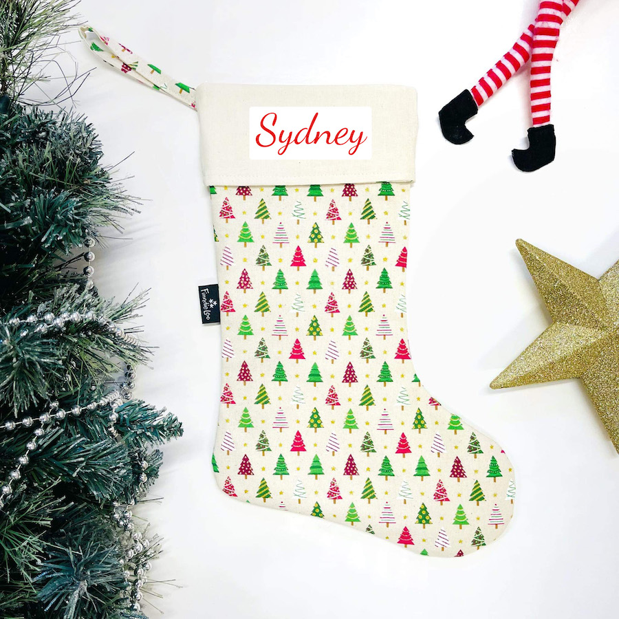 Each one comes with a first name and is a great size to add a few treats for your loved ones this Christmas. Invest in these now and never have to purchase your family's stockings again. A gorgeous keepsake to bring out each year. They are are sturdy enough to sit pretty and well without flopping when hung up by its handle. They are also fully lined on the inside.